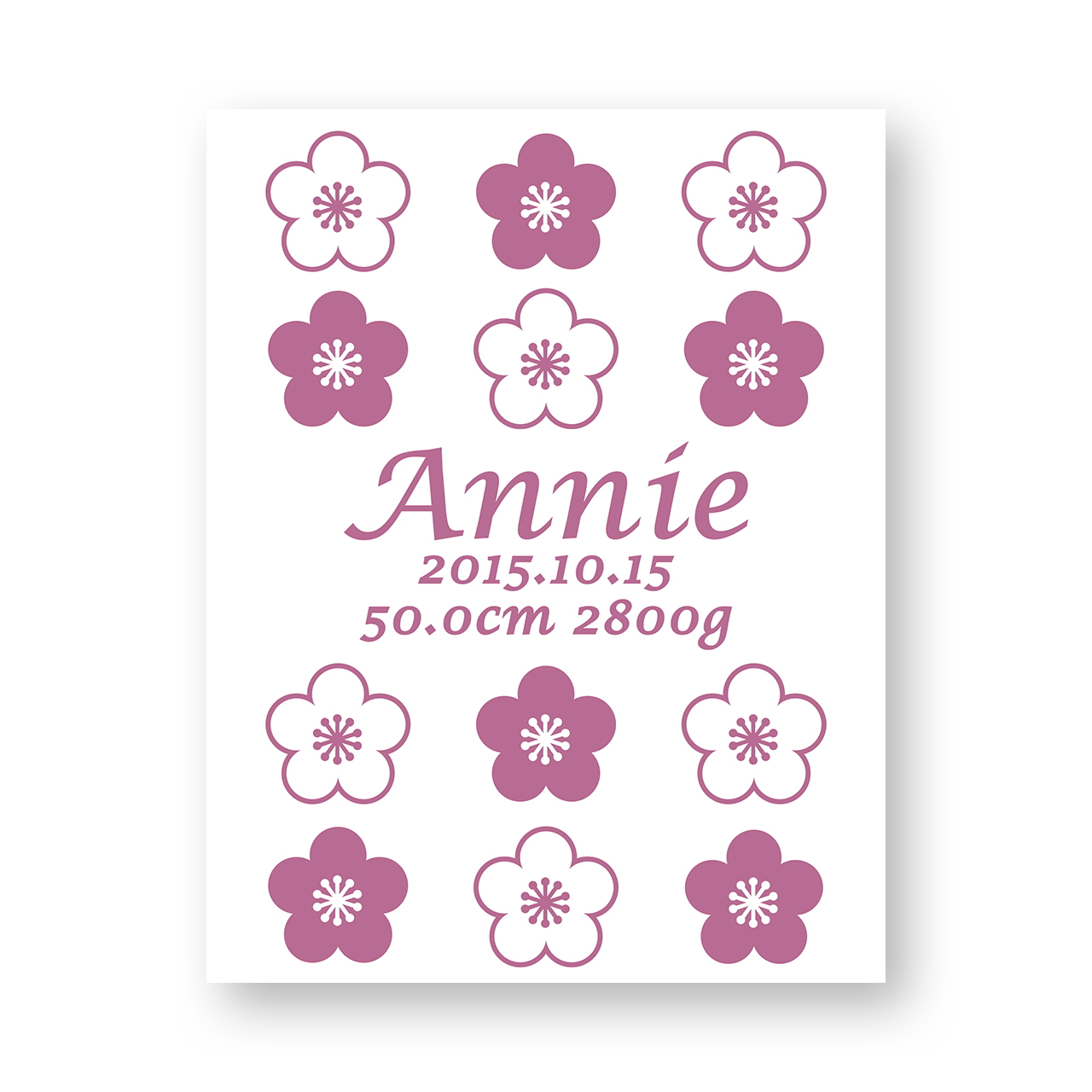 出生体重、出生身長など、その他の文字列をお入れします。「51.3cm 2847g」